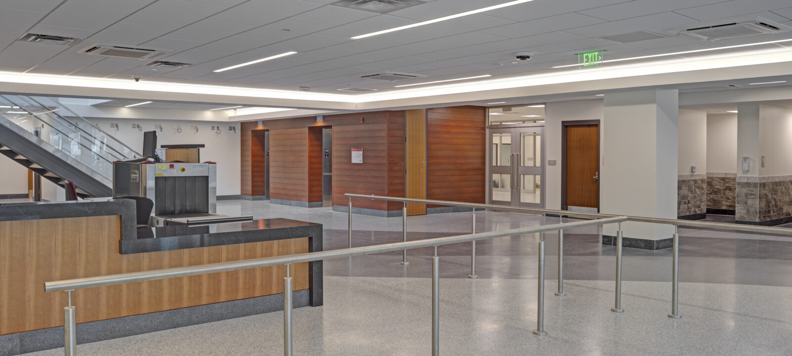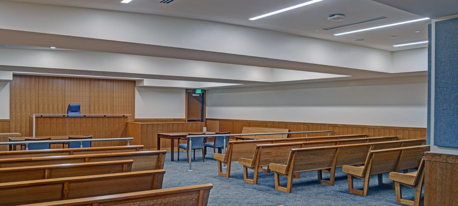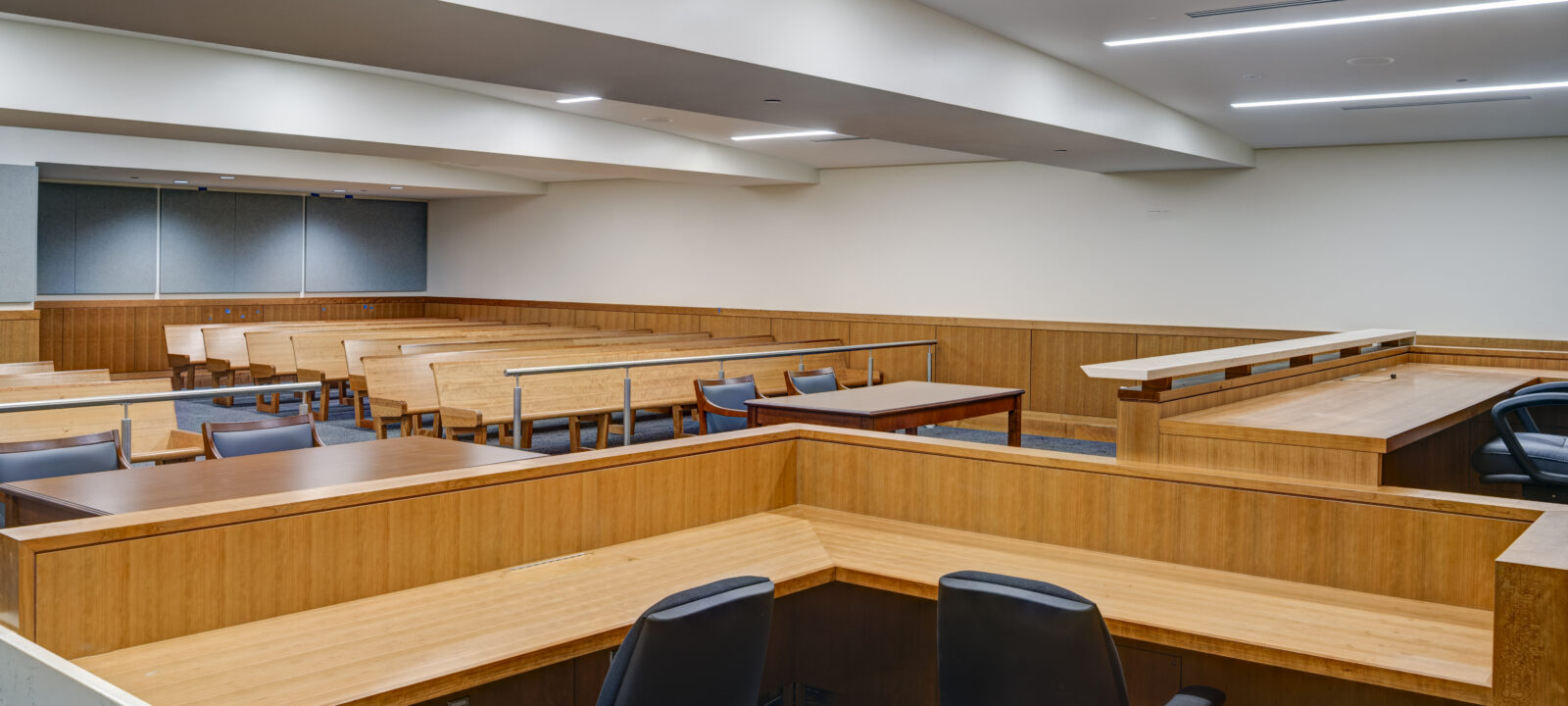 The project scope involved comprehensive demolition and reconstruction of the existing building while maintaining the original structural steel frameworkâessentially creating a new building within the existing structure. The interior construction encompassed five floors of judicial spaces, beginning with new courtroom construction featuring custom millwork, custom judge’s benches, and jury boxes designed specifically for court proceedings. Secure detention areas were constructed with specialized security features including detention elevators equipped with protective cages for prisoner transport. A secure sallyport was built with roll-up doors and vehicle processing areas to facilitate safe prisoner transfer. The facility includes separate public and judicial circulation systems, with dedicated public and judge’s staircases featuring terrazzo treads and landings. Gang restrooms and public facilities were installed throughout the building to serve court visitors and staff. Public service areas include cashier stations and service counters with custom granite tops, while a law library was constructed to support legal research. IT rooms and security command centers provide the technological backbone for building operations, while administrative offices and support spaces accommodate court staff.