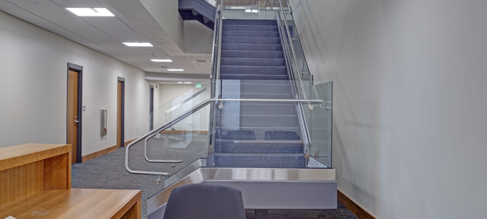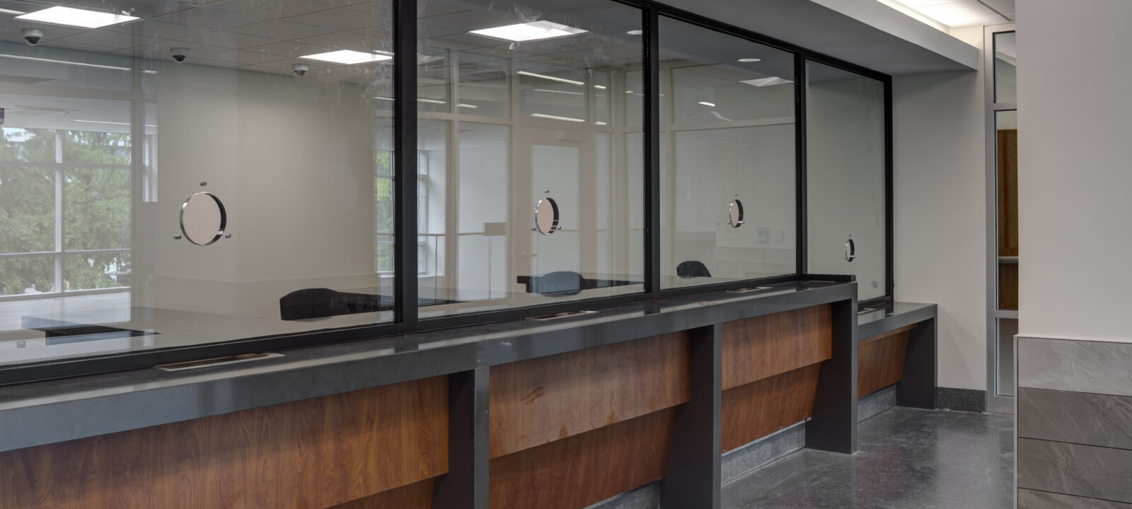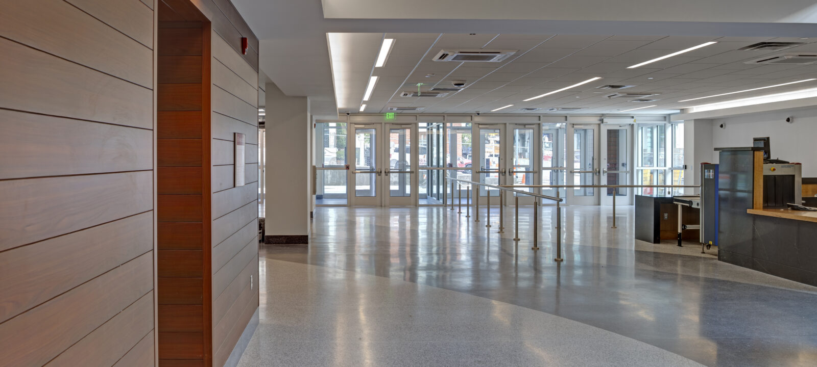 The project scope involved comprehensive demolition and reconstruction of the existing building while maintaining the original structural steel frameworkâessentially creating a new building within the existing structure. The interior construction encompassed five floors of judicial spaces, beginning with new courtroom construction featuring custom millwork, custom judge’s benches, and jury boxes designed specifically for court proceedings. Secure detention areas were constructed with specialized security features including detention elevators equipped with protective cages for prisoner transport. A secure sallyport was built with roll-up doors and vehicle processing areas to facilitate safe prisoner transfer. The facility includes separate public and judicial circulation systems, with dedicated public and judge’s staircases featuring terrazzo treads and landings. Gang restrooms and public facilities were installed throughout the building to serve court visitors and staff. Public service areas include cashier stations and service counters with custom granite tops, while a law library was constructed to support legal research. IT rooms and security command centers provide the technological backbone for building operations, while administrative offices and support spaces accommodate court staff.