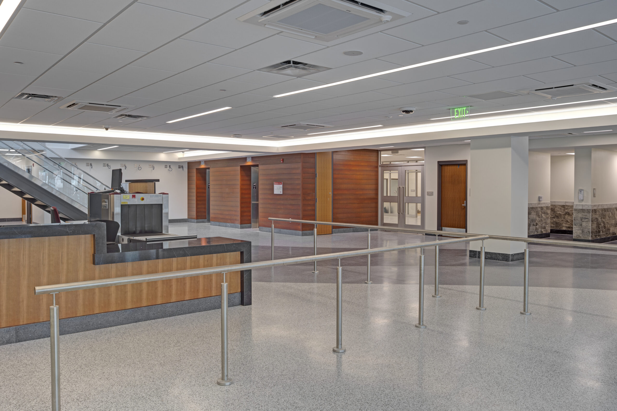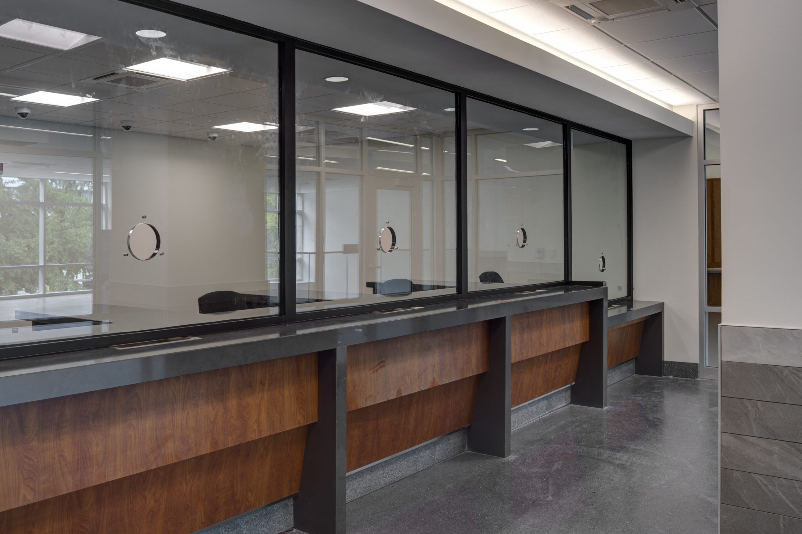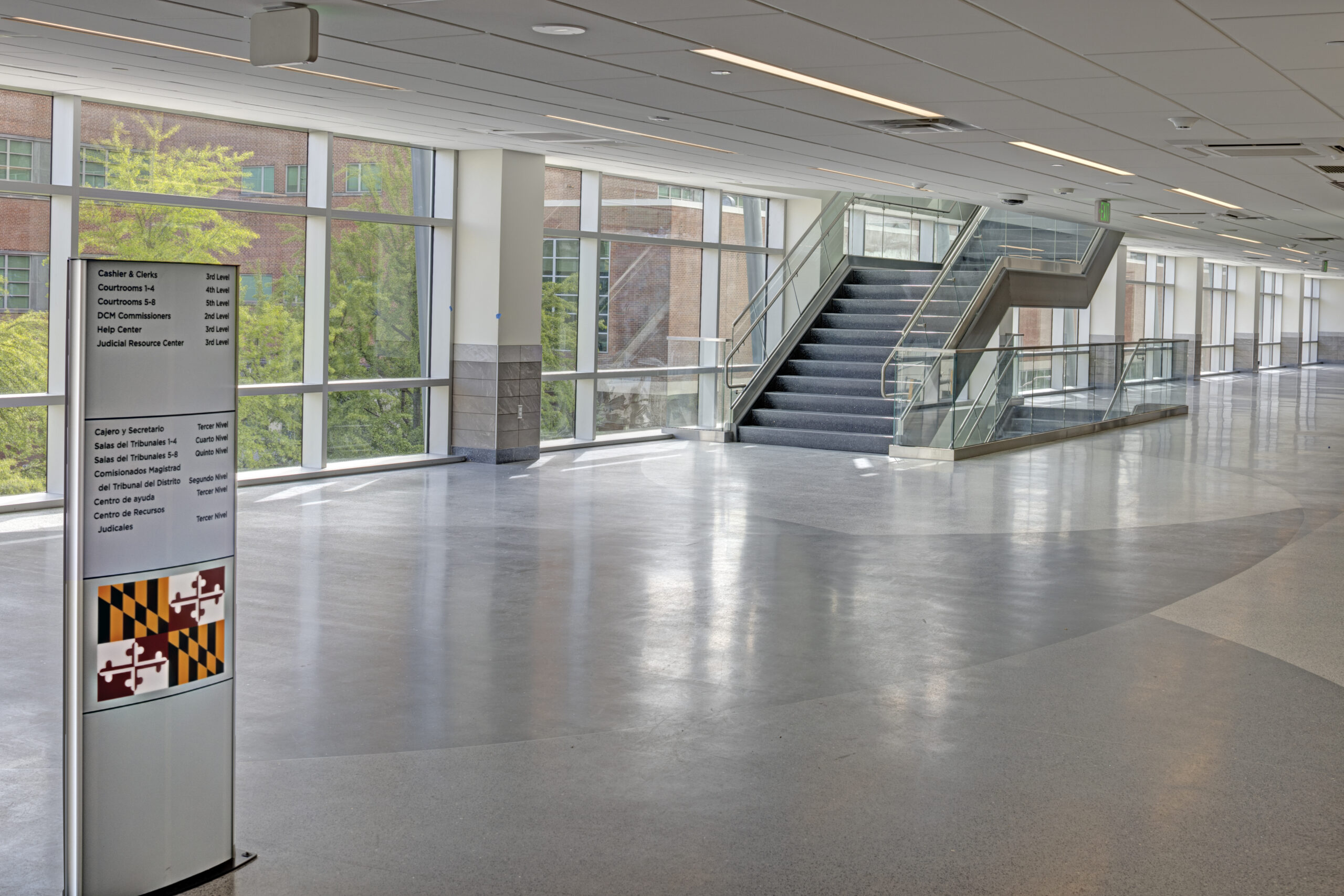 The new building provides distinct circulation patterns for the general public as well as the judges (and their staff), with separate elevator banks and monumental staircases featuring terrazzo treads/landings and a glass/steel railing. Notable public areas include restrooms with modern faucets that dispense soap and water and also dry hands, along with ceramic tile finishes and common areas that were installed throughout the building to serve both visitors and staff. The design improved the customer service areas, which include cashier stations and transaction counters with custom granite tops and ballistic-grade glass. Aside from the courtrooms and detention areas, other private areas included a law library that was constructed to support legal research, IT rooms and security command centers, and administrative offices and support spaces to support the courthouse staff. Shell spaces were also prepared for future tenant improvements, as needed.