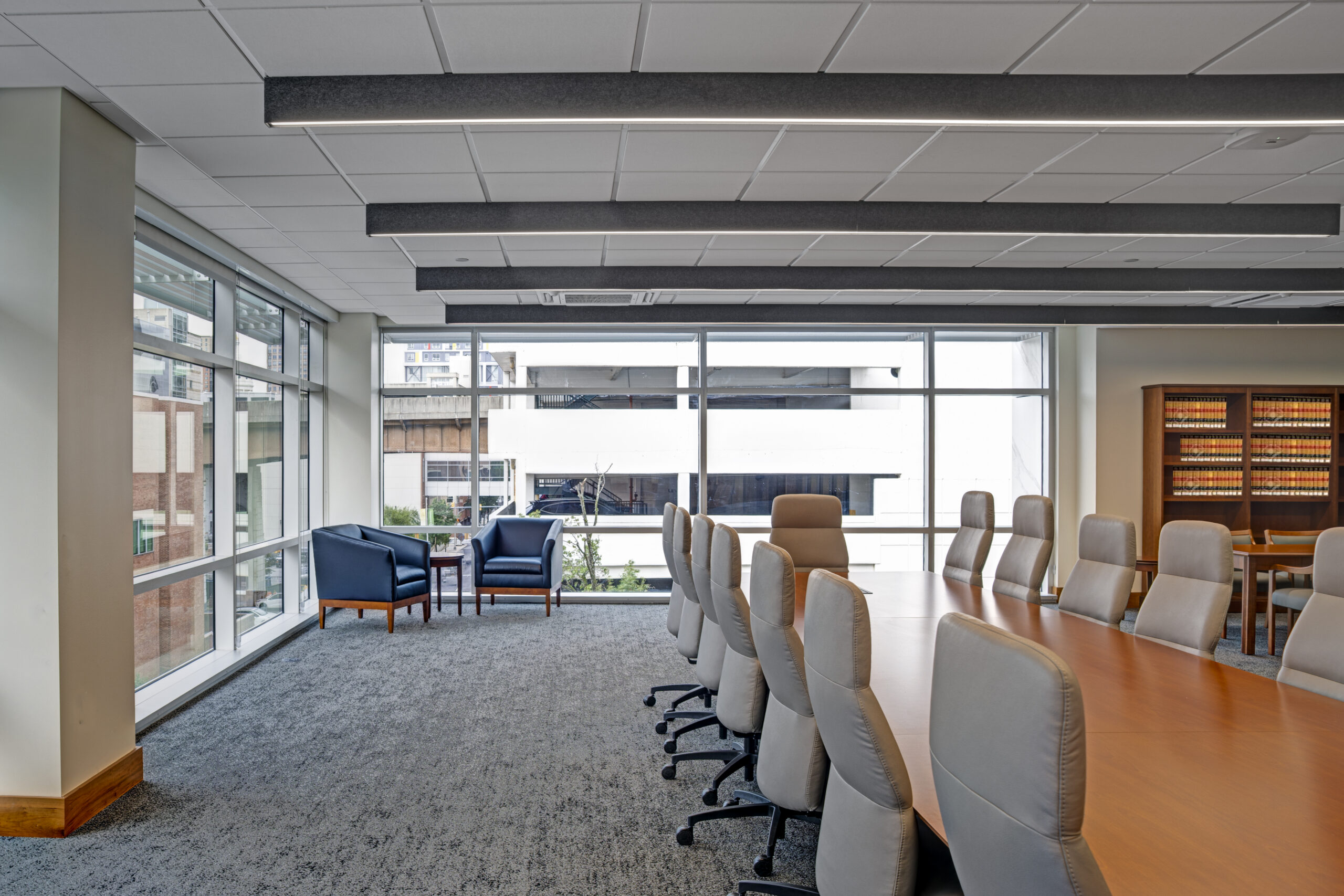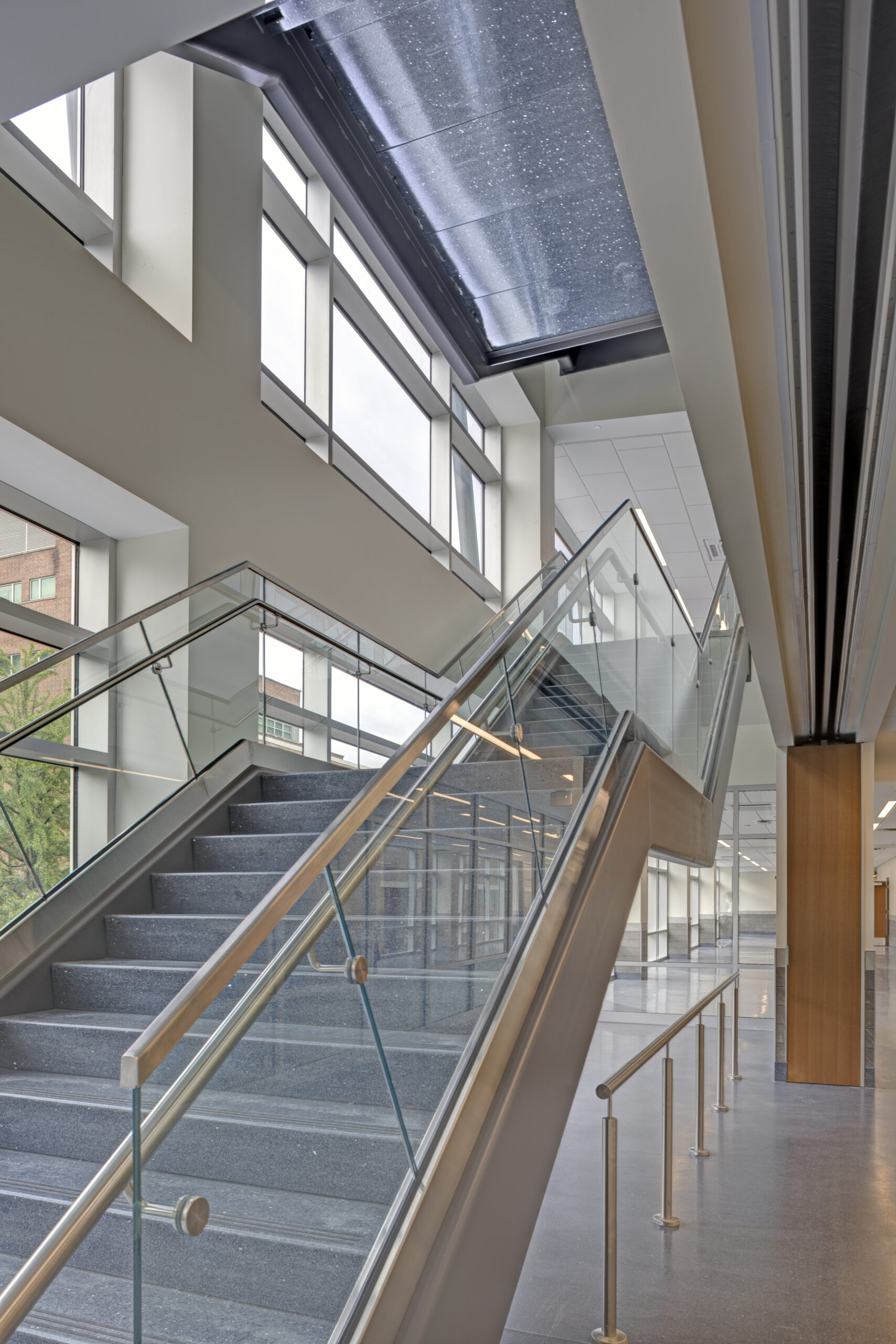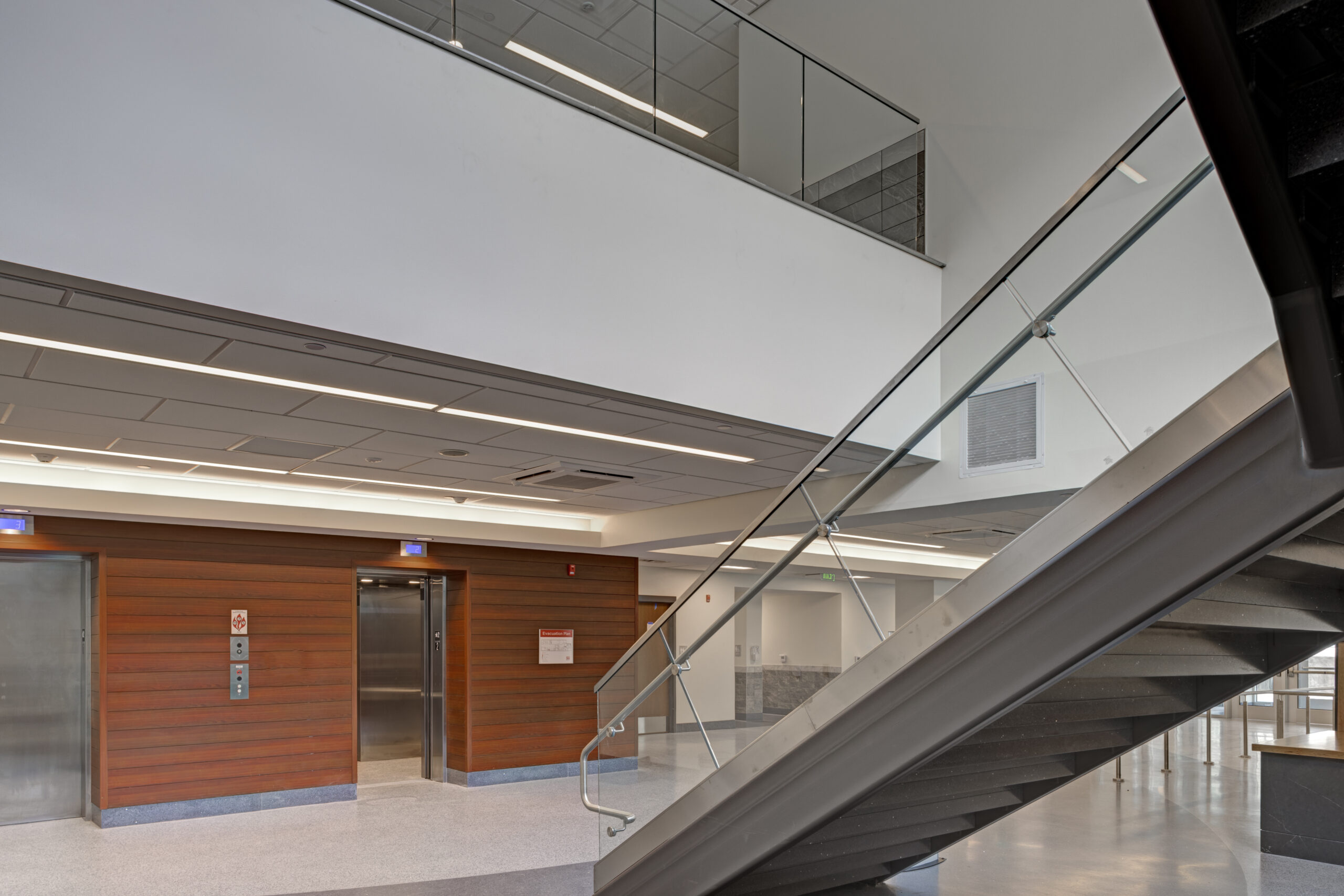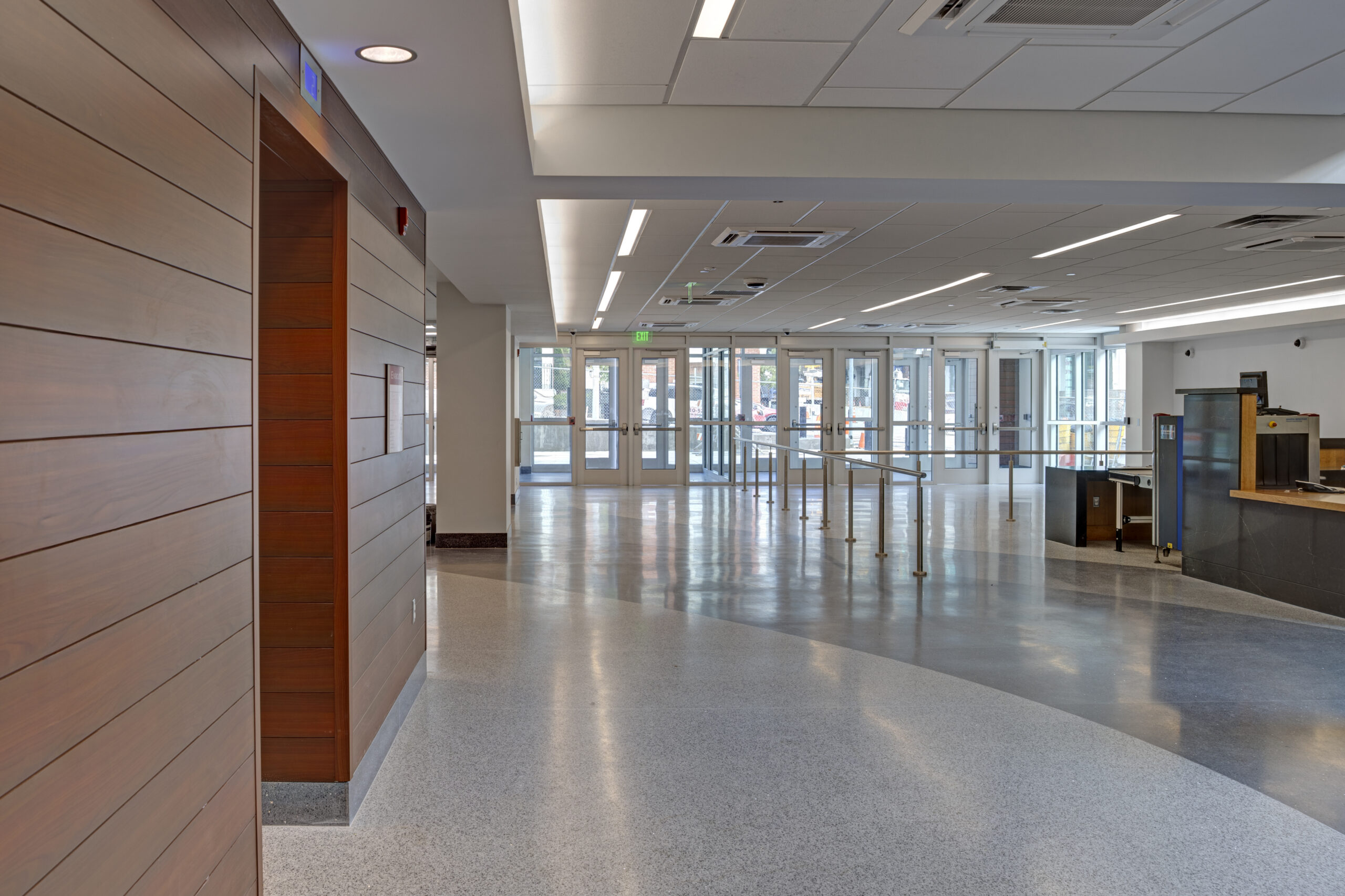 The new building provides distinct circulation patterns for the general public as well as the judges (and their staff), with separate elevator banks and monumental staircases featuring terrazzo treads/landings and a glass/steel railing. Notable public areas include restrooms with modern faucets that dispense soap and water and also dry hands, along with ceramic tile finishes and common areas that were installed throughout the building to serve both visitors and staff. The design improved the customer service areas, which include cashier stations and transaction counters with custom granite tops and ballistic-grade glass. Aside from the courtrooms and detention areas, other private areas included a law library that was constructed to support legal research, IT rooms and security command centers, and administrative offices and support spaces to support the courthouse staff. Shell spaces were also prepared for future tenant improvements, as needed.