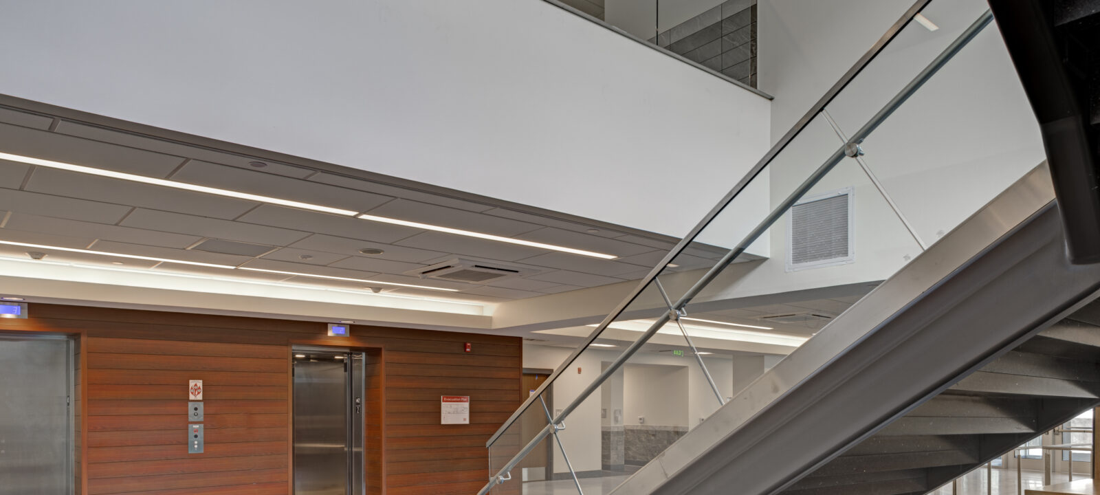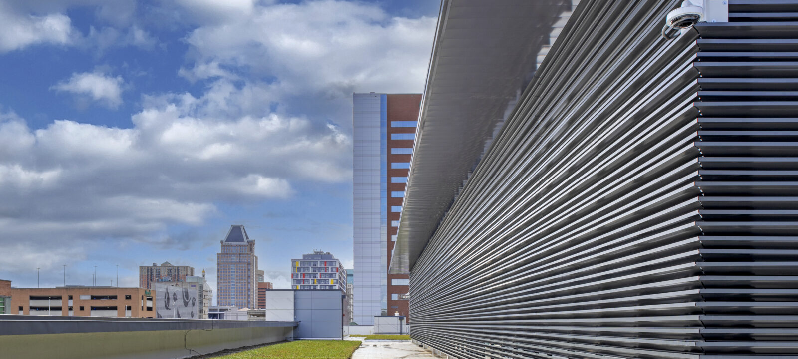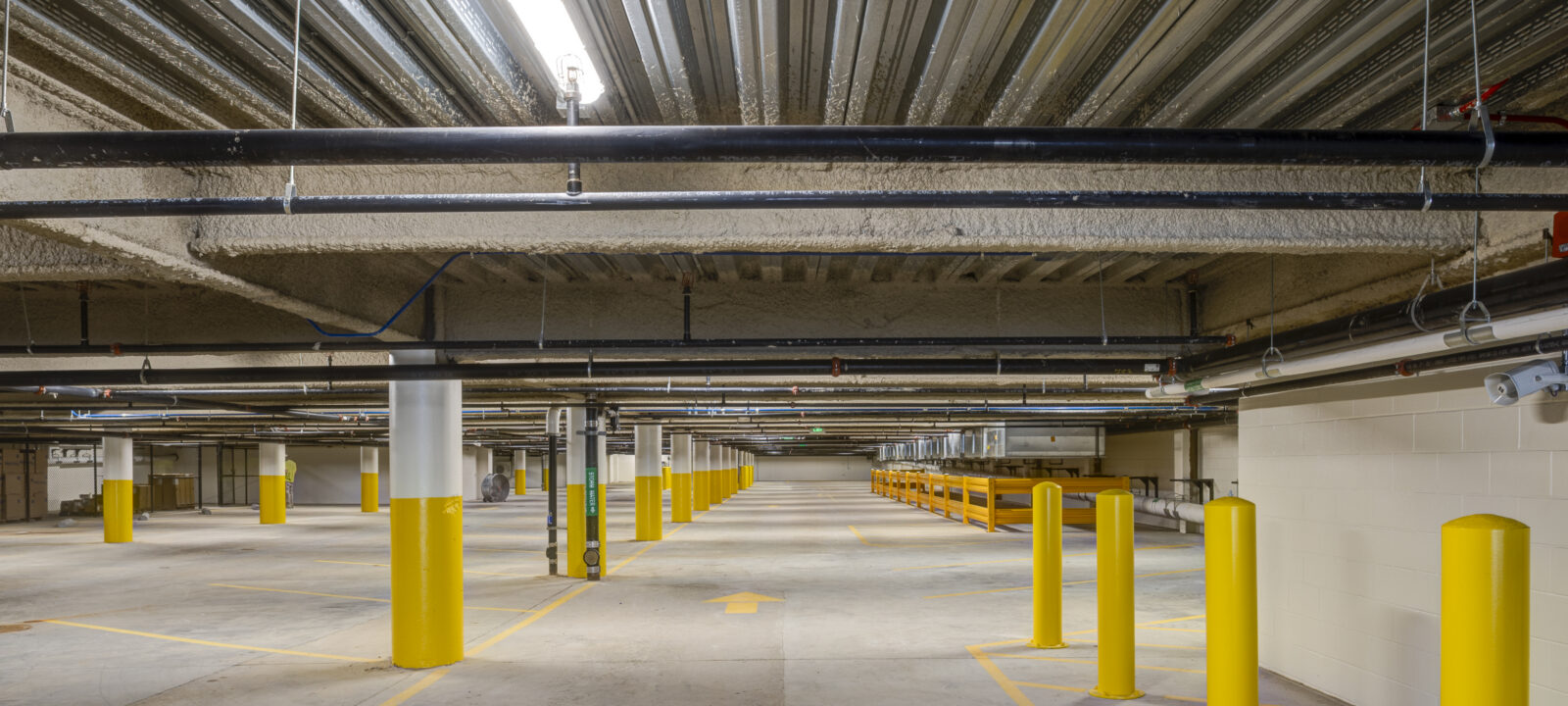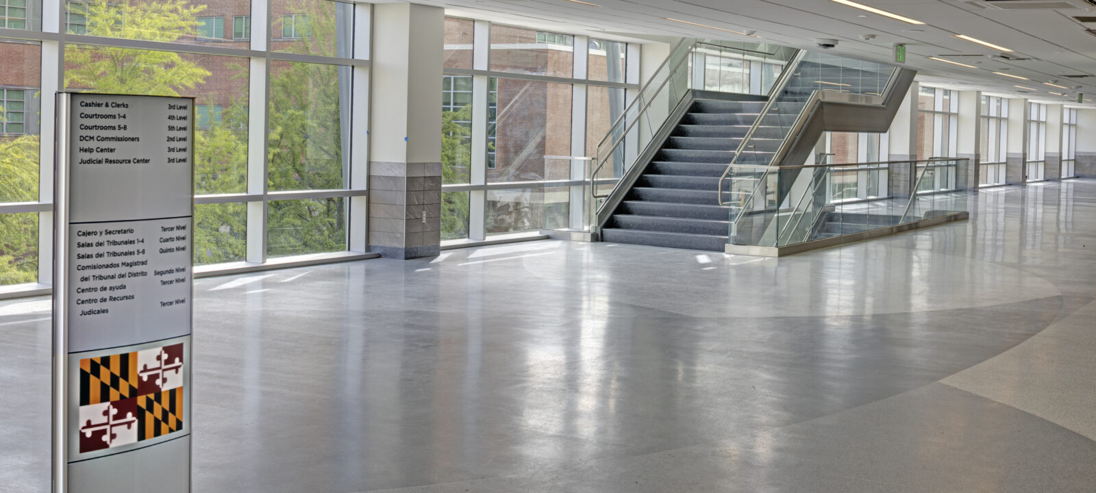 Mechanical, electrical, and plumbing systems were completely replaced throughout the facility. New HVAC systems include rooftop units, cassette units for flexible zone control, and dedicated parking garage ventilation systems to manage vehicle exhaust. The complete electrical service upgrade encompasses main distribution panels, comprehensive lighting systems, and power distribution to support all building operations and equipment. Modern plumbing systems feature sensor-operated fixtures for improved hygiene and water conservation, along with water treatment systems to protect equipment and ensure water quality. Comprehensive fire alarm and life safety systems meet all code requirements for this high-occupancy judicial facility. New natural gas services were installed in coordination with Baltimore Gas & Electric and required street excavation and utility coordination in the active urban environment. Condensate drainage and pump systems were installed throughout to manage HVAC system discharge and prevent water damage.