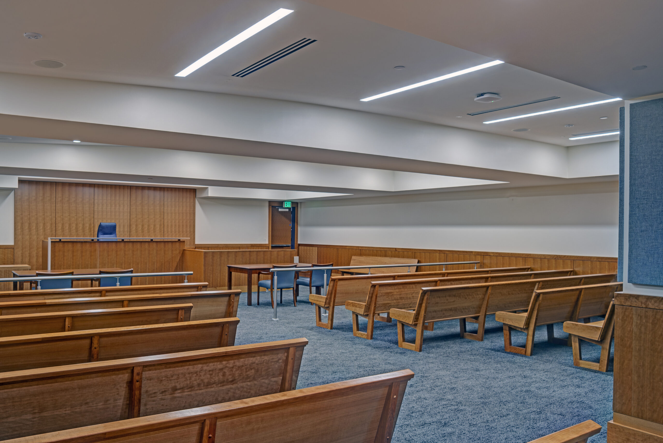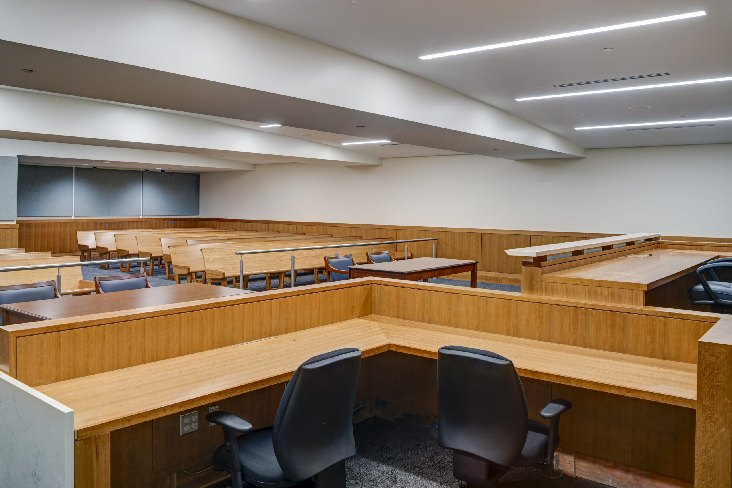 The interior construction encompassed five floors of public-facing judicial spaces along with private staff workspaces, beginning with new courtroom construction featuring custom millwork, custom judge’s benches, and jury boxes designed specifically for court proceedings. Secure detention areas were constructed with specialized security features including detention elevators equipped with protective cages for prisoner transport. A secure sallyport was built with roll-up doors and vehicle processing areas to facilitate safe prisoner transfer.