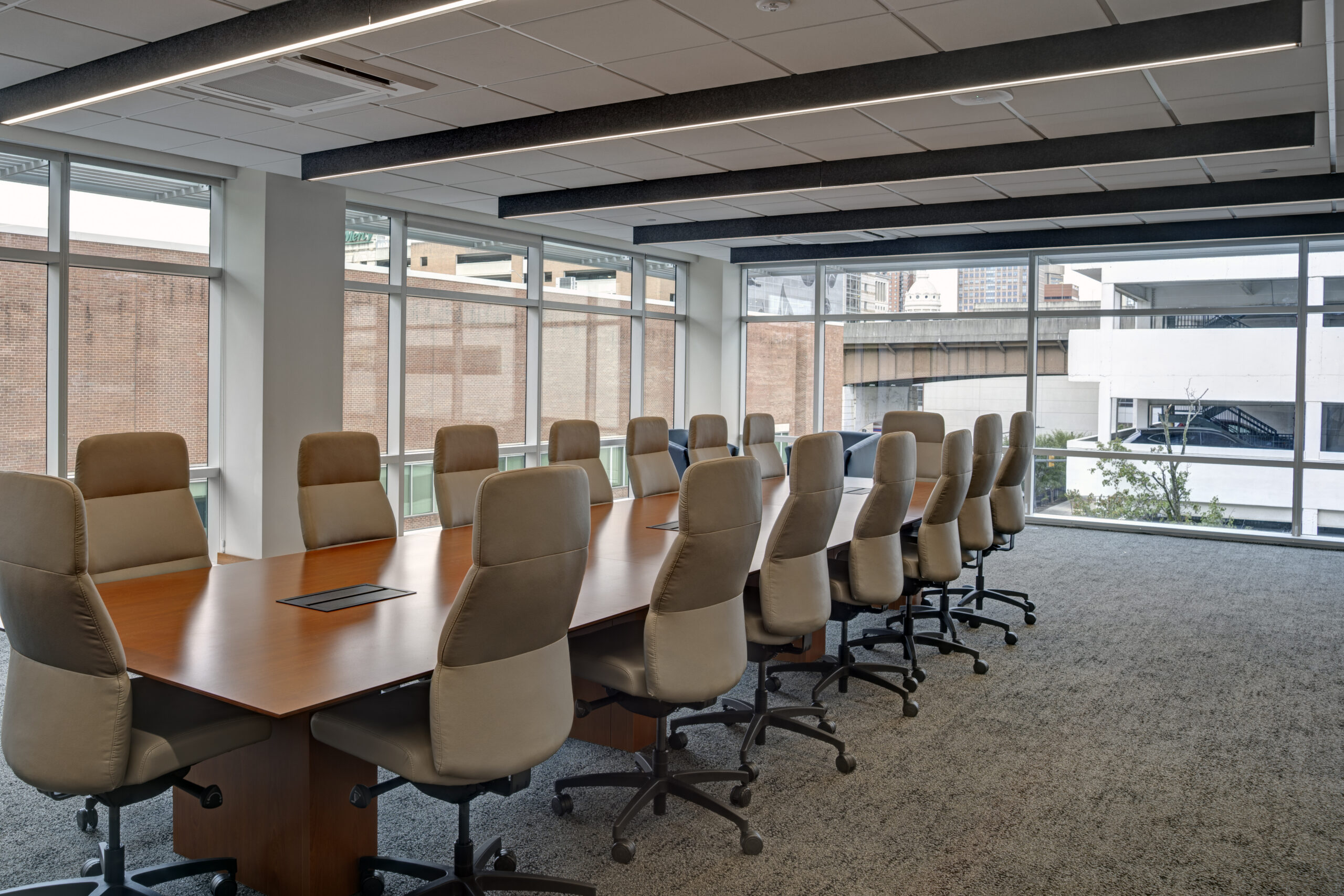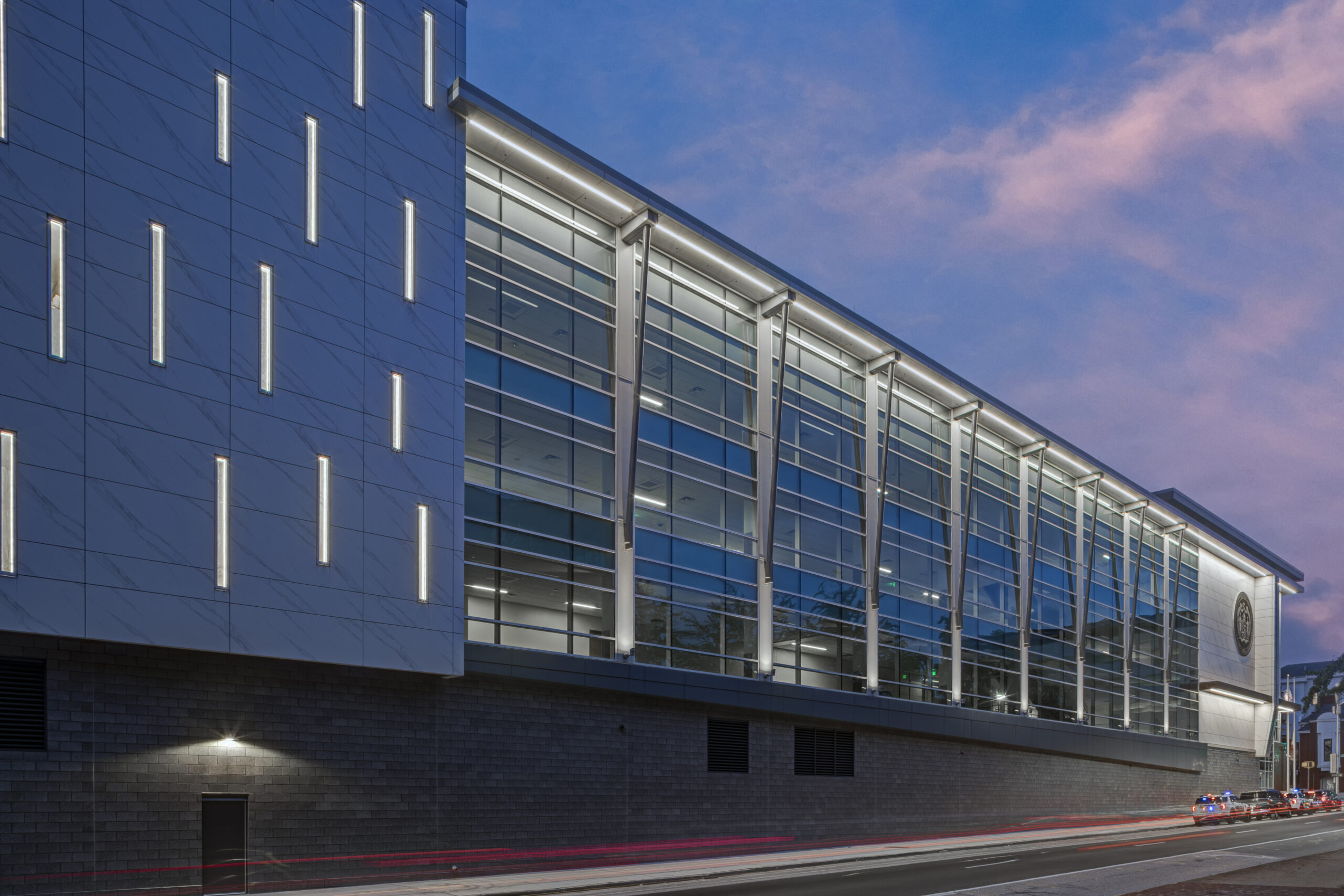 The tight sight constraints also impacted the installation skin of the building, which aesthetically juxtaposes yet compliments the historic Mt. Vernon neighborhood that borders the building on the western elevation. The installation process included the interfacing of six distinct veneer materials including : ground face block, ceramic panel (stone-look), wood-look aluminum panels, traditional composite panels, rain screen, and curtainwall glass, much of which had to be upgraded to ballistic-rated to ensure the safety of personnel in the building within an urban environment surrounded by tall buildings. Coordinating the installation of distinct systems to avoid conflicts, executing the architect’s specified patterns, and ensuring the building would be water-tight and thermally sound were especially remarkable feats, given that all work had to be completed via boom-lifts within a narrow alleyway along the LOD fence line.