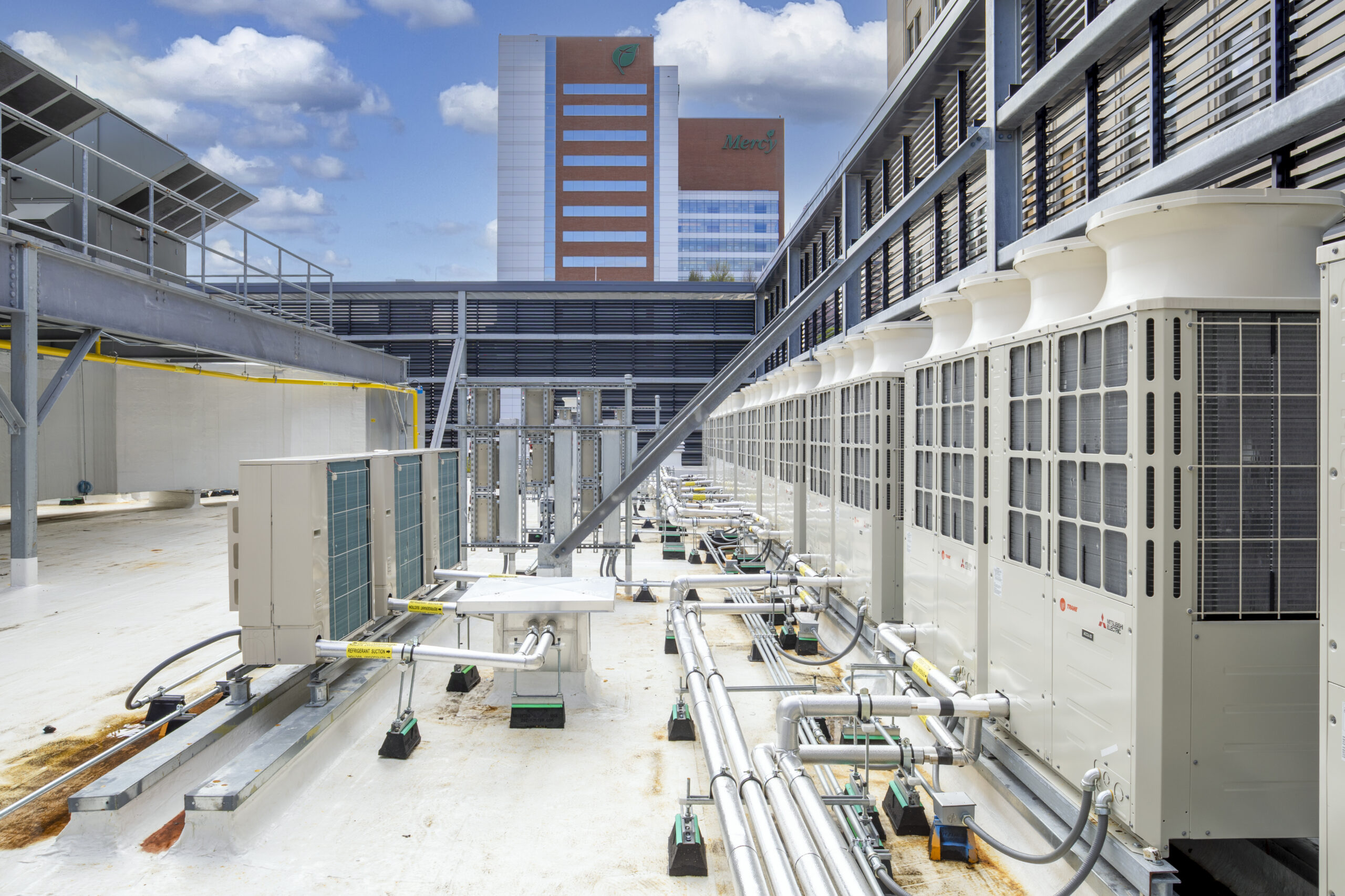Challenges for the site included managing lane closures throughout the duration of the project and completing all façade demolition and re-construction with less than 20’ of working space. Even with the lane closure, there was an extremely tight limit of disturbance around the east and south perimeter of the building, and the west side of the building along the alleyway required extensive coordination with the neighboring properties to maintain access, continuity of trash removal services, etc. One of the most critical aspects of the job, which required intensive oversight due to the limitations of the LOD, was the utilization of a 175-ton crane that was deployed on Calvert Street (with permission via street closure permit). The crane operated nearly 200 feet of boom and jib to deliver and set the DOAS units and Air-Cooled Condensing units to the rooftop. These units were then concealed on all sides by a complex architectural roof screen from I-83 and surrounding buildings. The substantial mechanical loads added to the roof level required load transfer down to new footers and ground improvements beneath the garage level, and the low clear heights required strategic planning to utilize the typical equipment required to install deep foundations.
