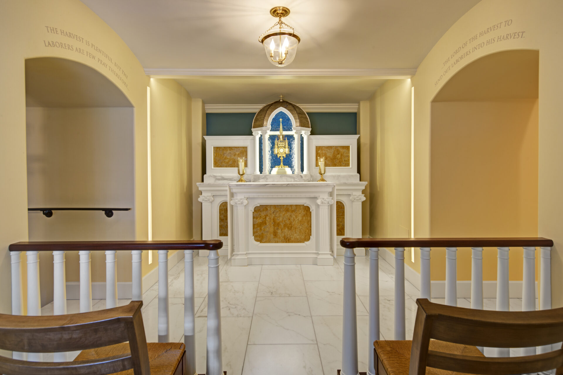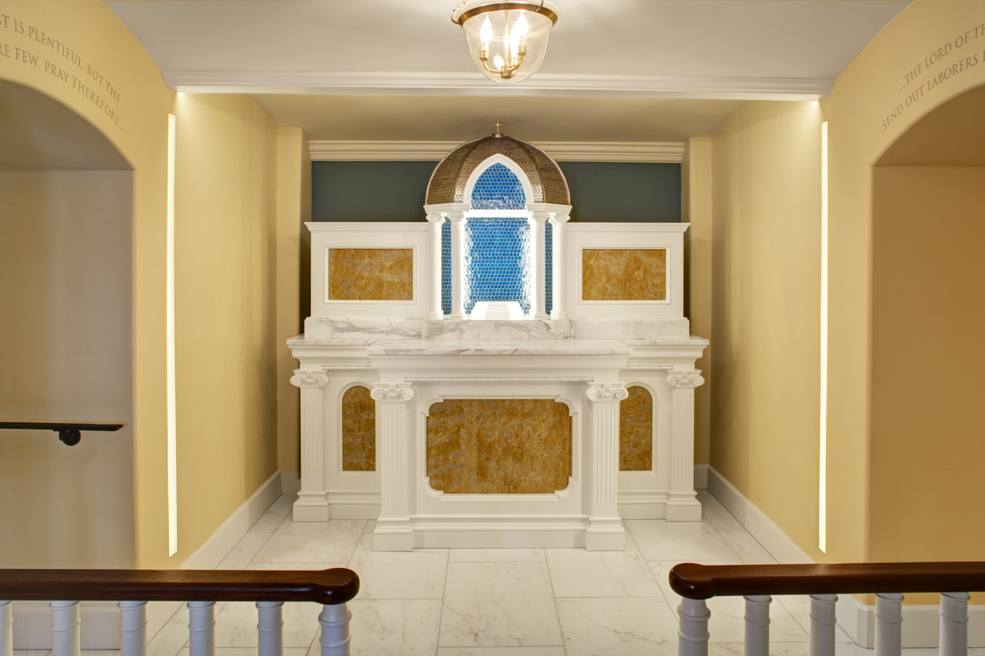 Return to PortfolioPrior to its restoration, the Adoration Chapel below the sanctuary of the Basilica of the Assumption was just one of a number of small rooms. Though certainly a sacred space for contemplation and prayer, the chapel presented less than an inviting space for worship; however, a fisherman at Loch Raven reservoir “caught” a most unusual item – an antique Gothic monstrance – which he gifted to the Archdiocese of Baltimore. This restored monstrance sits beneath the octagonal baldachino, with its white Corinthian columns and brilliant blue tiles at the altar within the restored Adoration Chapel.