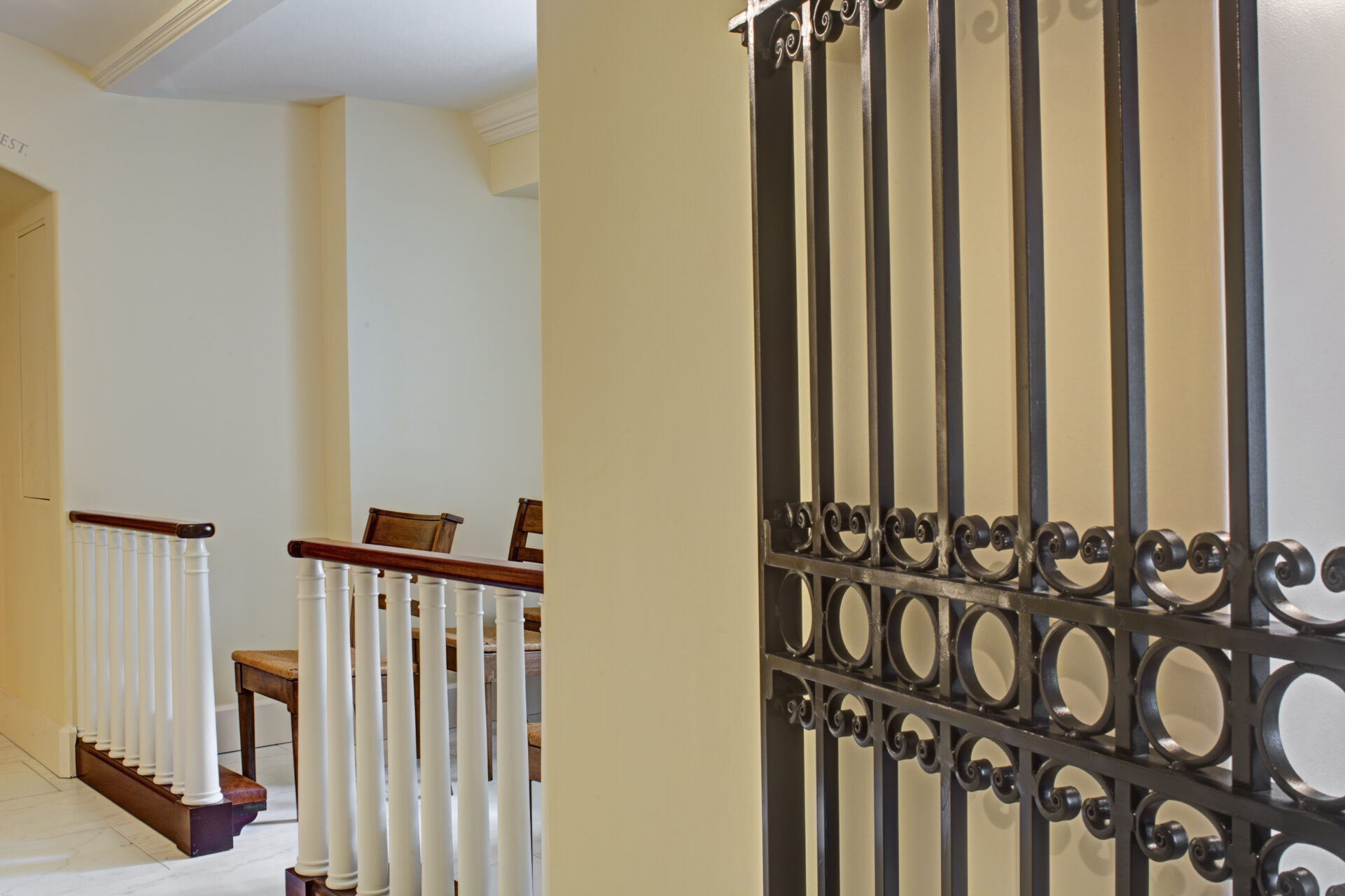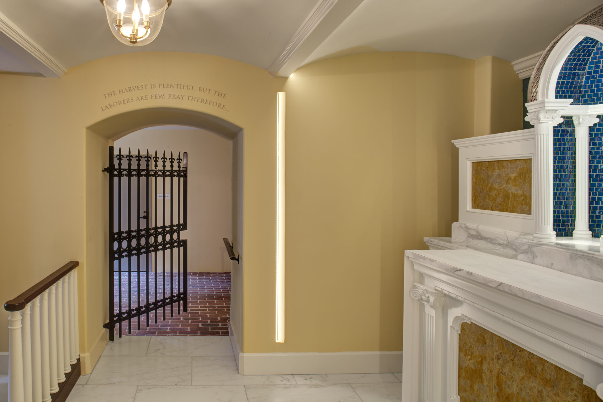 Belying its small size, restoration of the chapel involved a tremendous amount of work. CAM’s forces completed virtually all of the work themselves, with the exception of the new marble flooring, construction of the altar, and installation of the new lighting. The plaster arches were modified and restored, the brick flooring removed, and the substrate leveled for installation of the marble flooring. The wrought iron gate was designed, custom fabricated, and installed to provide a distinctive entrance into the chapel. Previously exposed conduits were hidden behind new drywall. A new railing mimicking that of the sanctuary above was installed to separate the nave of the chapel from its seating, and new millwork was installed throughout to provide the sense of history that a chapel within America’s first cathedral warrants.