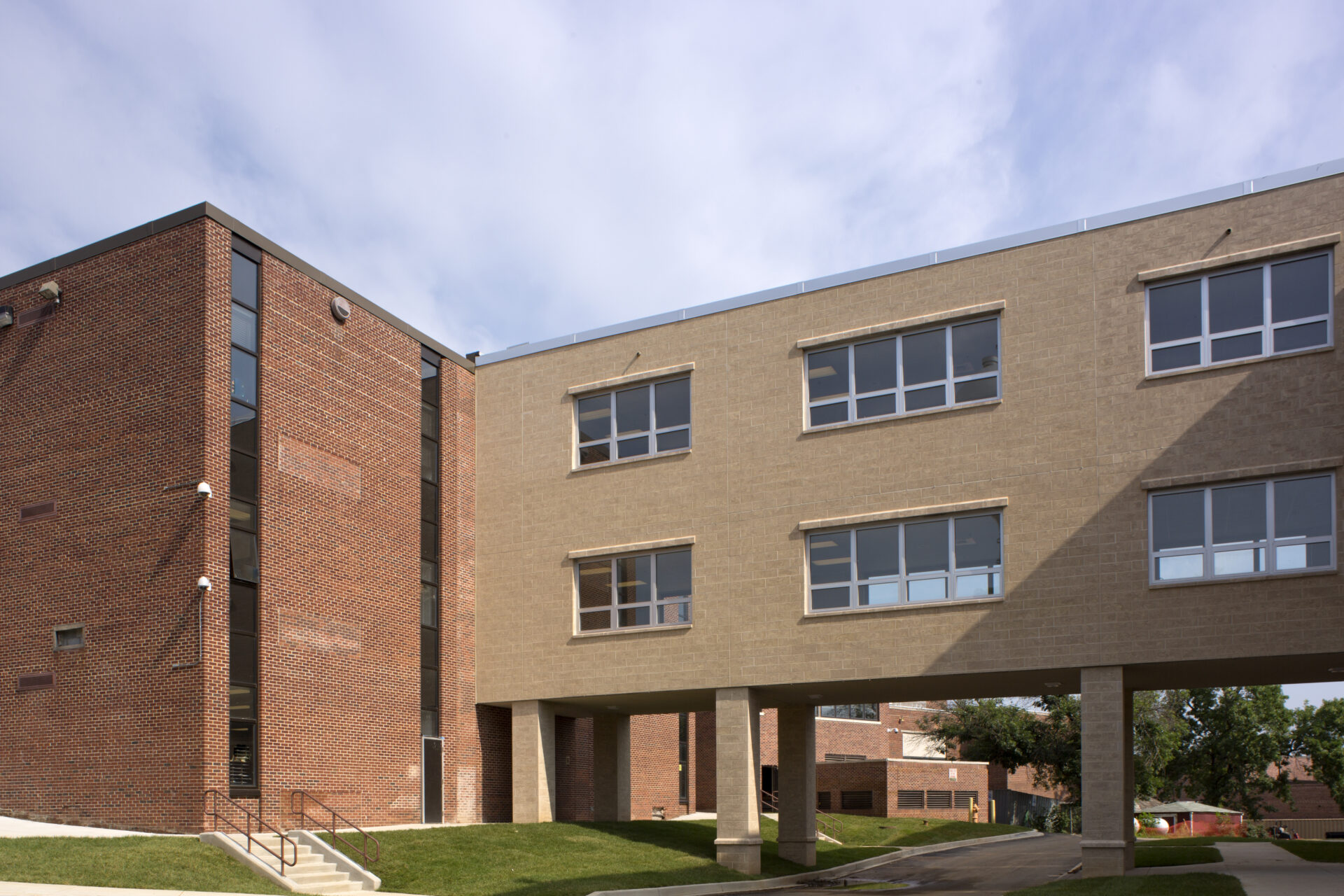 The addition includes a new cafeteria with a full service kitchen, pantry and serving areas, eleven new Biology classrooms, Chemistry and Physics laboratories with prep and storage rooms, restrooms, offices and circulation areas. Science casework, shelving and fume hoods as well as extensive IT requirements differentiate these spaces from typical high school classrooms. A new HVAC system was also installed that includes a two pipe chilled water system and boiler.