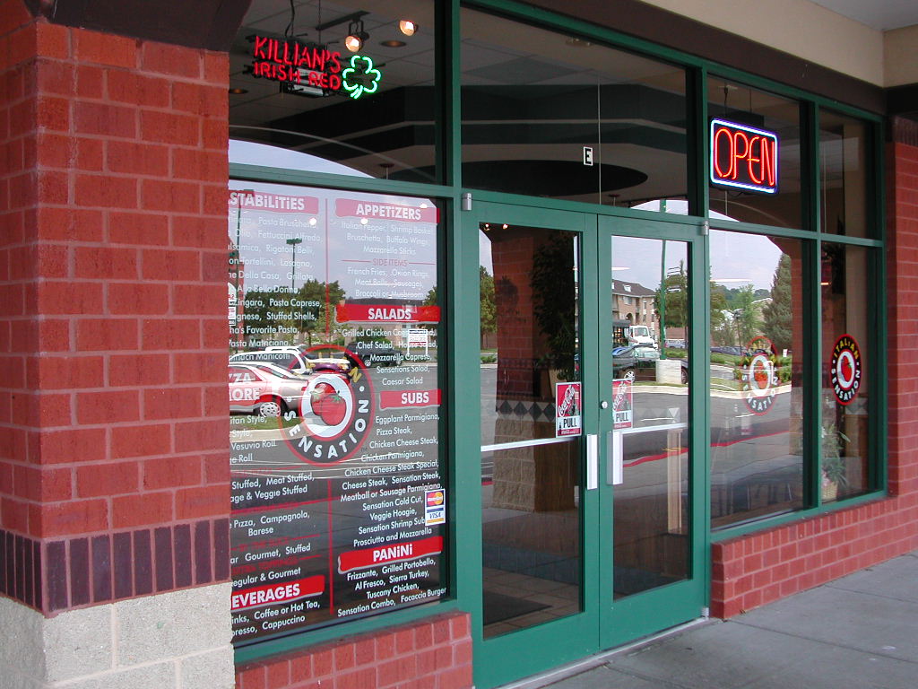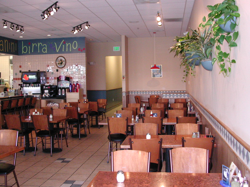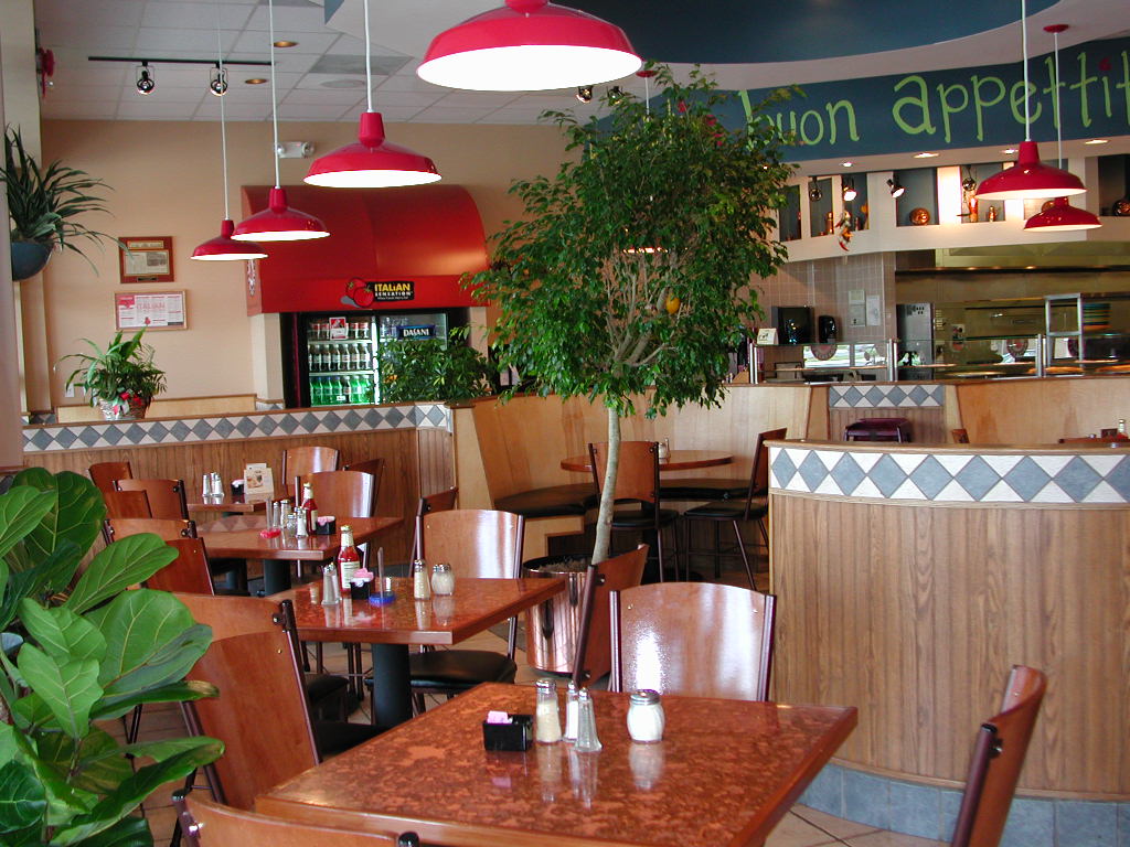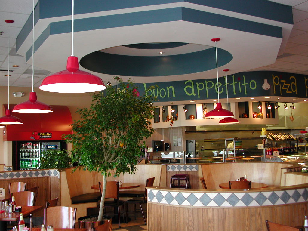 Upon entering Italian Sensations, your attention is drawn to the extensive use of architectural drywall bulkheads with interesting built-ins. Over the eating area is an interesting, stepped bulkhead in the shape of an octagon. The bulkhead over the counter features hand-brushed, stenciled paneling.